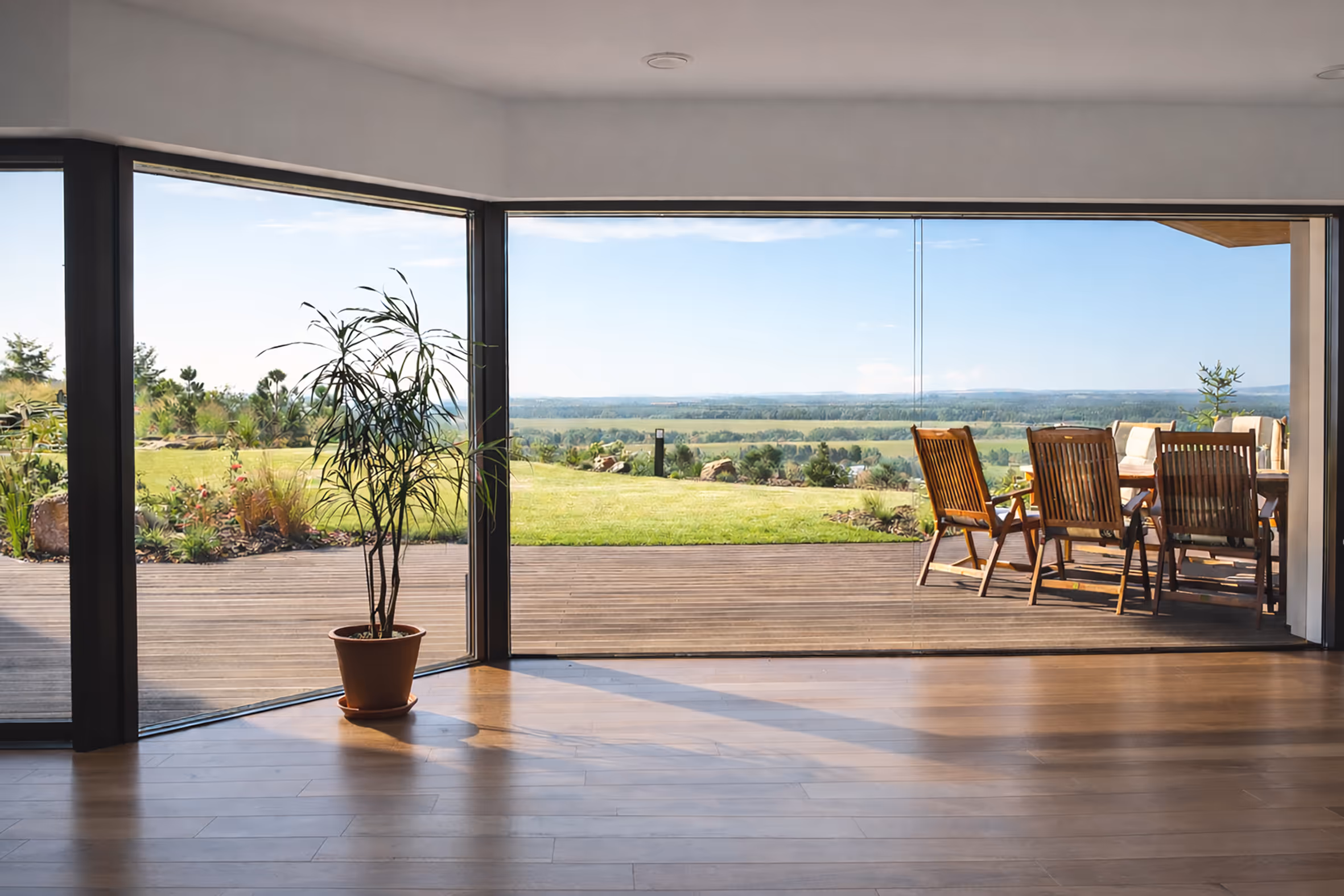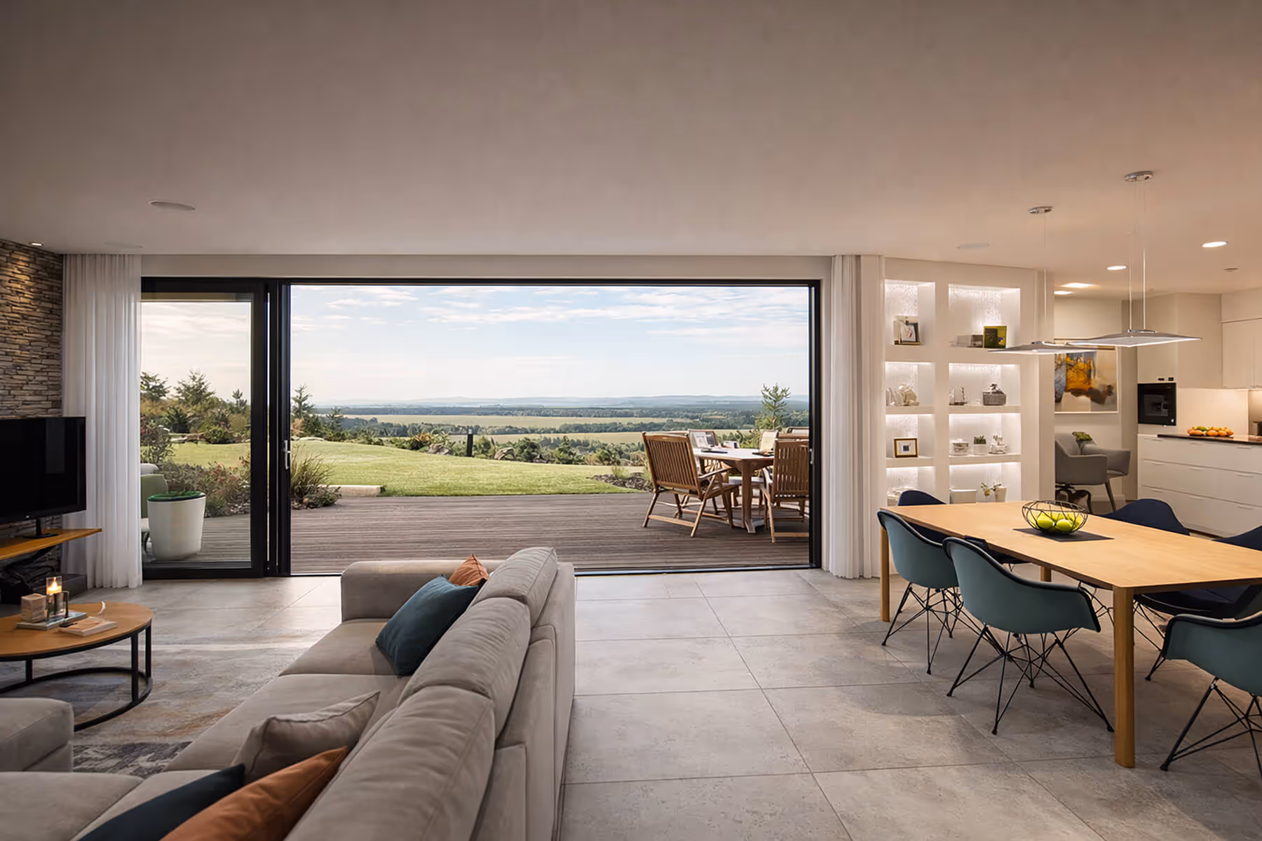 Žádné poschodí, žádné překážky. Z obývacího pokoje vstoupíte rovnou na terasu. Pohyb po domě je bezpečný a pohodlný v každém věku.